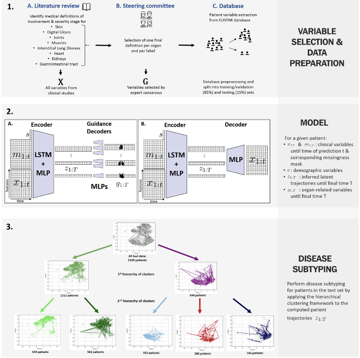 We develop and apply a semi-supervised generative deep learning framework to model Systemic Sclerosis patient trajectories in the EUSTAR database (~14,000 patients across 67,000 medical visits) and identify clinically meaningful subtypes beyond the existing limited/diffuse classification. We aim to discover new patient clusters by modeling multi-organ involvement over time, which is key for better stratification and prognosis. (read more here: link )